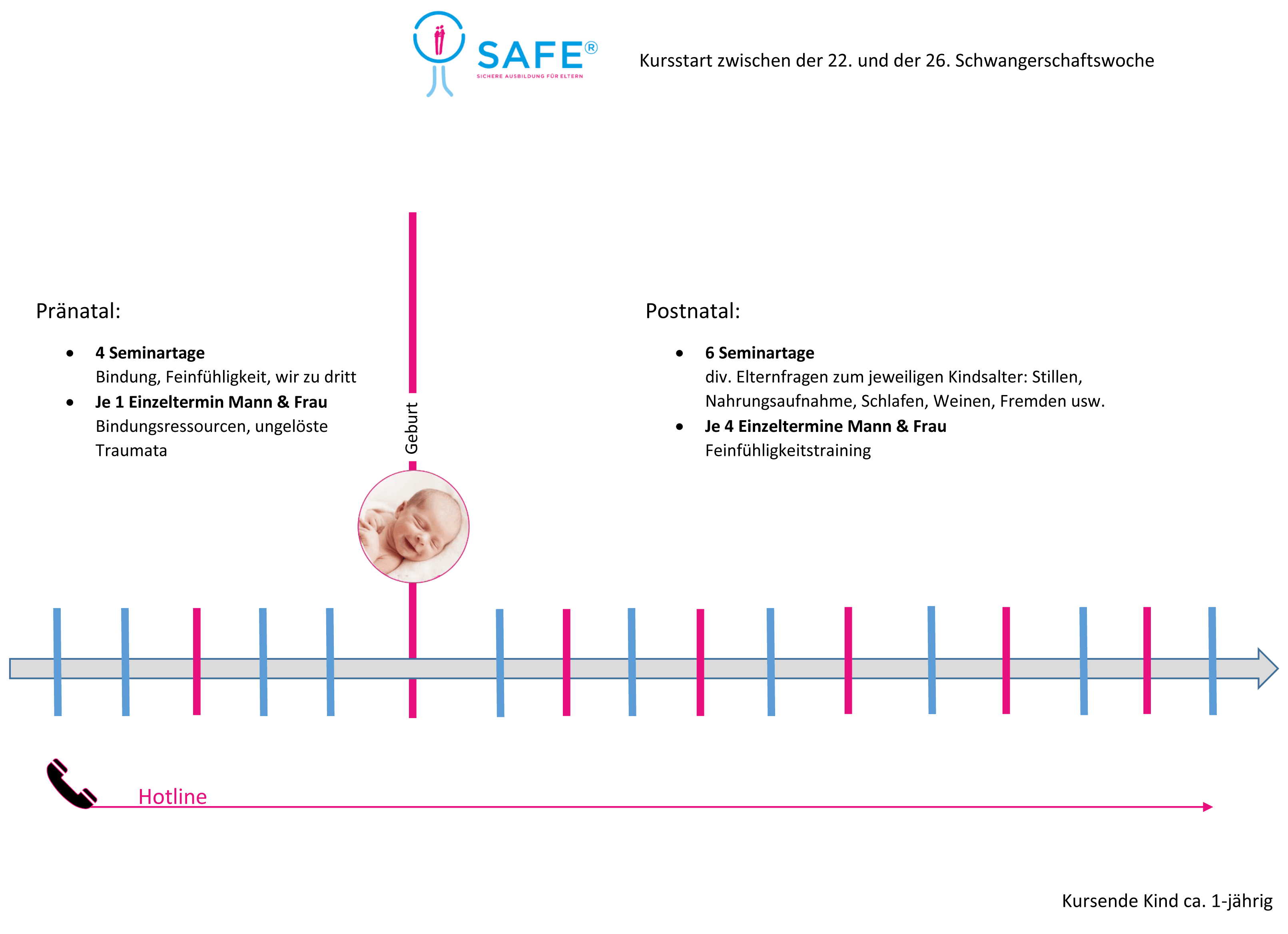 SAFE®  startet ca in der 22. Schwangerschaftswoche und dauert bis zum Ende des Ersten Lebensjahres des Kindes. SAFE® bereitet Paare auf die Elternschaft vor und begleitet sie während den ersten 12 (wichtigsten) Lebensmonaten des Kindes.